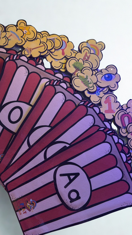 Cada palomita de maíz incluye una imagen cuyo nombre comienza con el sonido inicial de la vocal correspondiente, ayudando a los niños a identificar y asociar sonidos de manera divertida y efectiva. Ideal para trabajar conciencia fonológica, discriminación auditiva y vocabulario inicial.