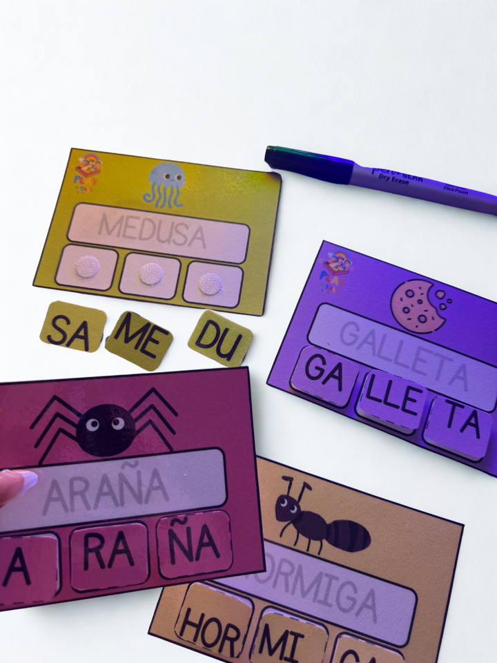 Este set incluye 48 tarjetas diseñadas para trazar y formar palabras de 3 sílabas. Los niños podrán practicar la escritura, segmentar sílabas y construir palabras de manera interactiva y divertida. Ideal para reforzar la conciencia silábica, la escritura y la lectura inicial.